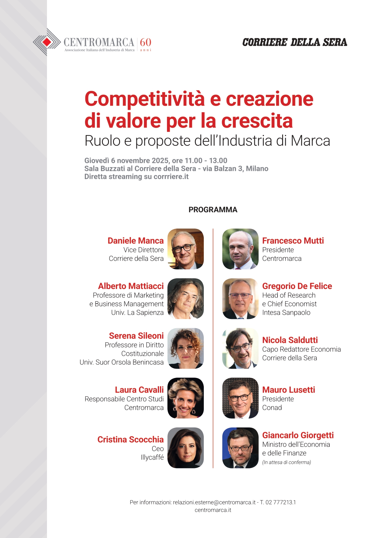 Promosso da Centromarca in collaborazione con il Corriere della Sera, l’evento “Competitività e creazione di valore per la crescita. Ruolo e proposte dell’Industria di Marca” mira a rafforzare la presenza e la visibilità dell’Industria di Marca nel dibattito sul futuro del Paese.